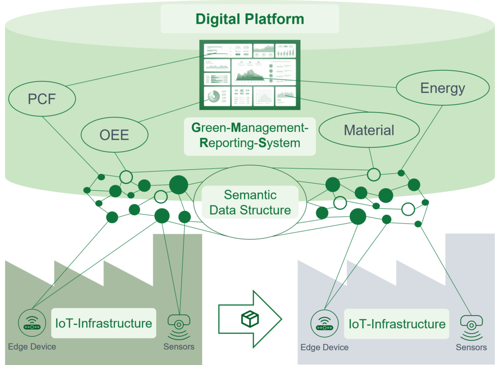 This is followed by the technical design in work packages 2 to 4: an IoT system architecture for data collection of sustainability parameters is developed, GreenKPIs are defined and a semantic data model is created that links product, process and resource data.