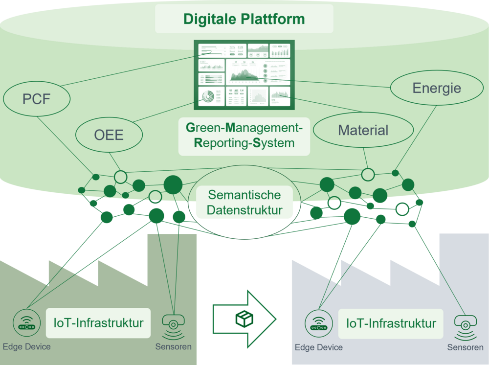 Darauf folgt in Arbeitspaketen 2 bis 4 die technische Konzeption: Es werden eine IoT-Systemarchitektur zur Datenerfassung von Nachhaltigkeitsparametern entwickelt, GreenKPIs definiert und ein semantisches Datenmodell erstellt, das Produkt-, Prozess- und Ressourcendaten verknüpft.